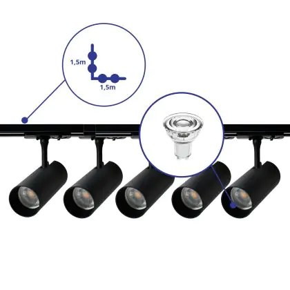 | Manufacturer Name | Complete L shaped 1-Phase Track Set Black incl. 5x Spot fixture + GU10 2700K 3W Dim – 1,5 x 1,5 mete | |